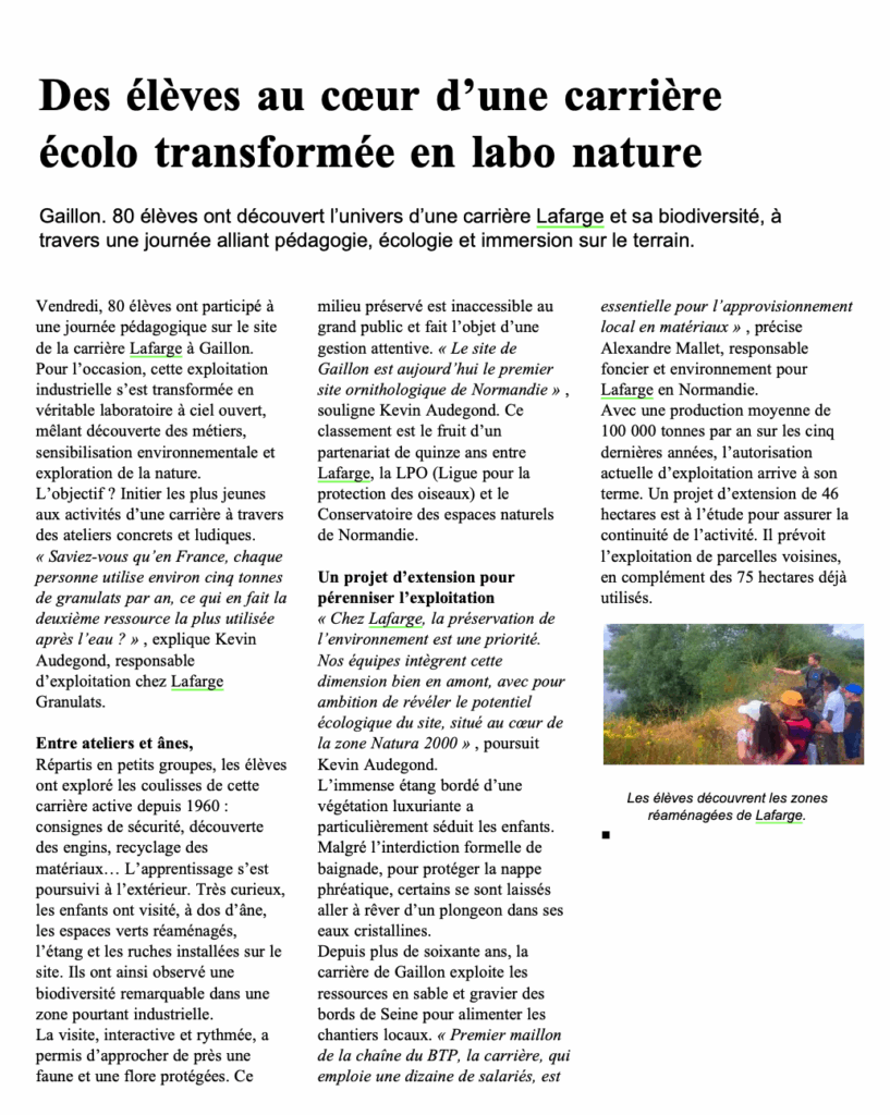 Des élèves de Gaillon ont eu l’opportunité de visiter la carrière d’extraction de granulats le vendredi 27 juin 2025. A cette occasion, la presse locale a réalisé un article dans Paris Normandie.