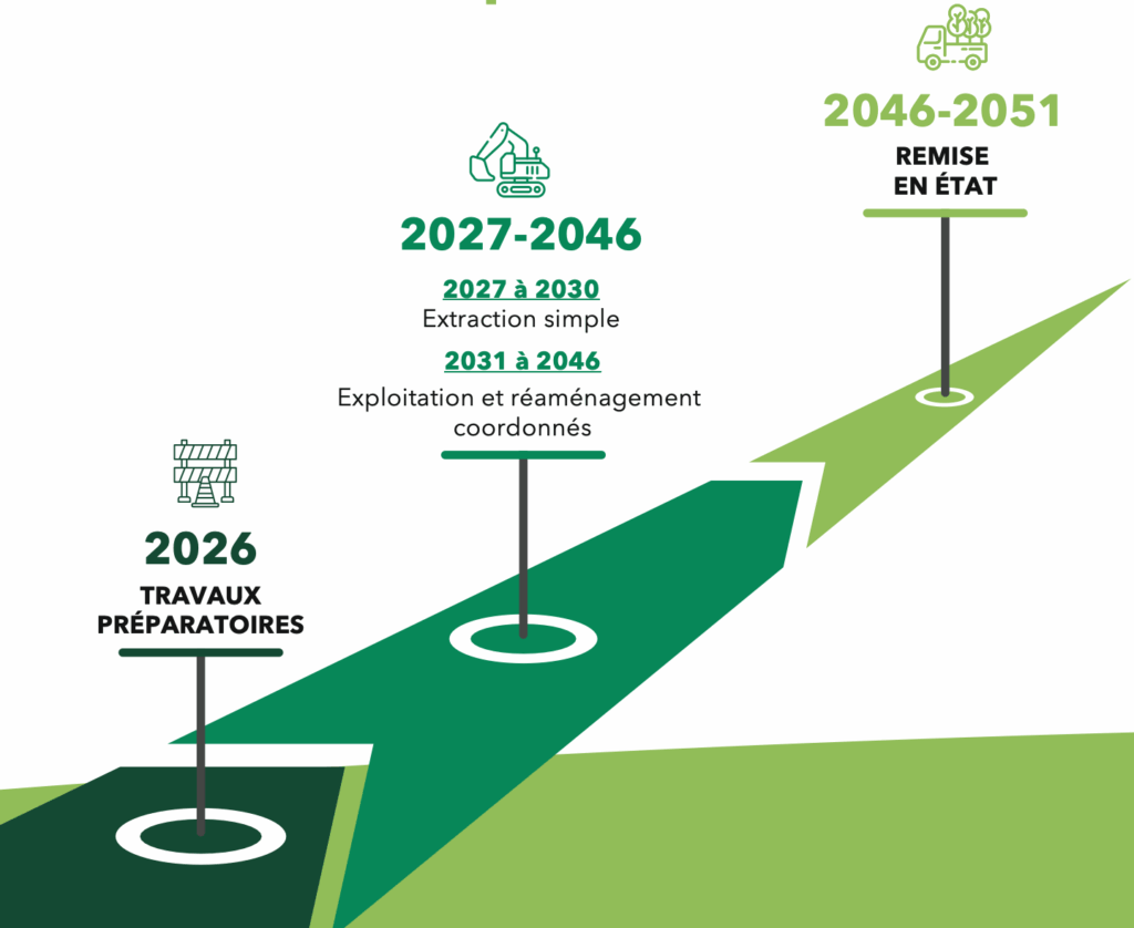 La durée d’autorisation demandée est de 25 ans. Elle se décompose en plusieurs périodes d’activité : 1 an de travaux préparatoires (diagnostic archéologique, aménagements paysagers tels que plantation de haie, vergers), 3 années d’extraction simple, suivies de 16 années d’exploitation coordonnée, combinant extraction et réaménagement des parcelles en simultané. Enfin, 5 années supplémentaires permettront de finaliser les opérations de réaménagement.