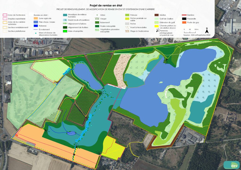 Le plan de réaménagement du projet a été pensé pour s’insérer harmonieusement dans l’environnement local. Pendant 2 ans, des experts ont observé la faune, la flore, les sols, l’eau et les paysages. Grâce à ces études, Lafarge Granulats a conçu un plan de réaménagement qui permet d’accroître les zones écologiques, (appelées à être classées Natura 2000), tout en contribuant au développement de l’activité touristique.